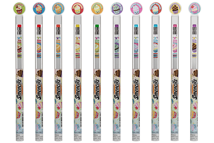 Once they're dry, we attach the erasers and apply the stickers around them that identify which scent was infused into each Smencil. Lastly, we put each Smencil into its own recyclable plastic freshness tube that comes with a collectible character top cap!- 1 Case = 500 Smencils